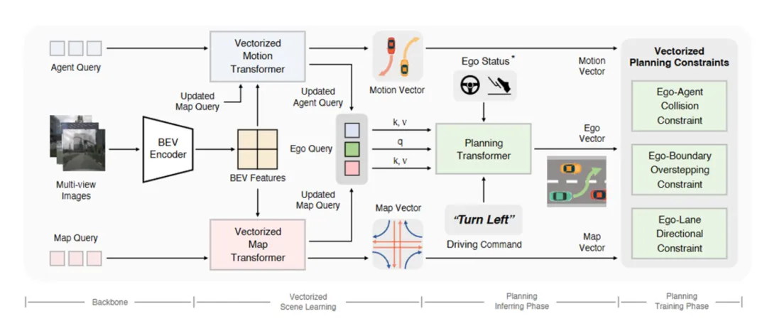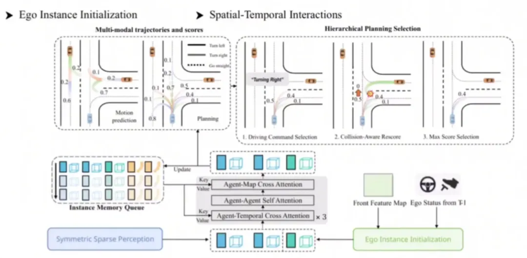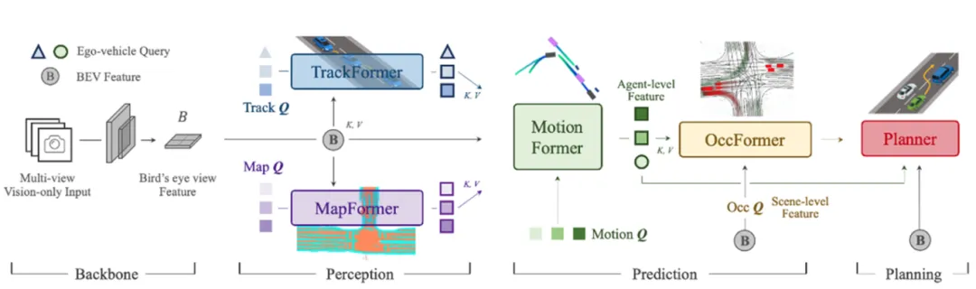 该模型包括特征提取,特征转换,感知模块(目标检测+多目标跟踪+建图部分,TrackFormer、MapFormer),预测模块(MotionFormer、OccFormer),规划模块(指令导航、Occ矫正轨迹)