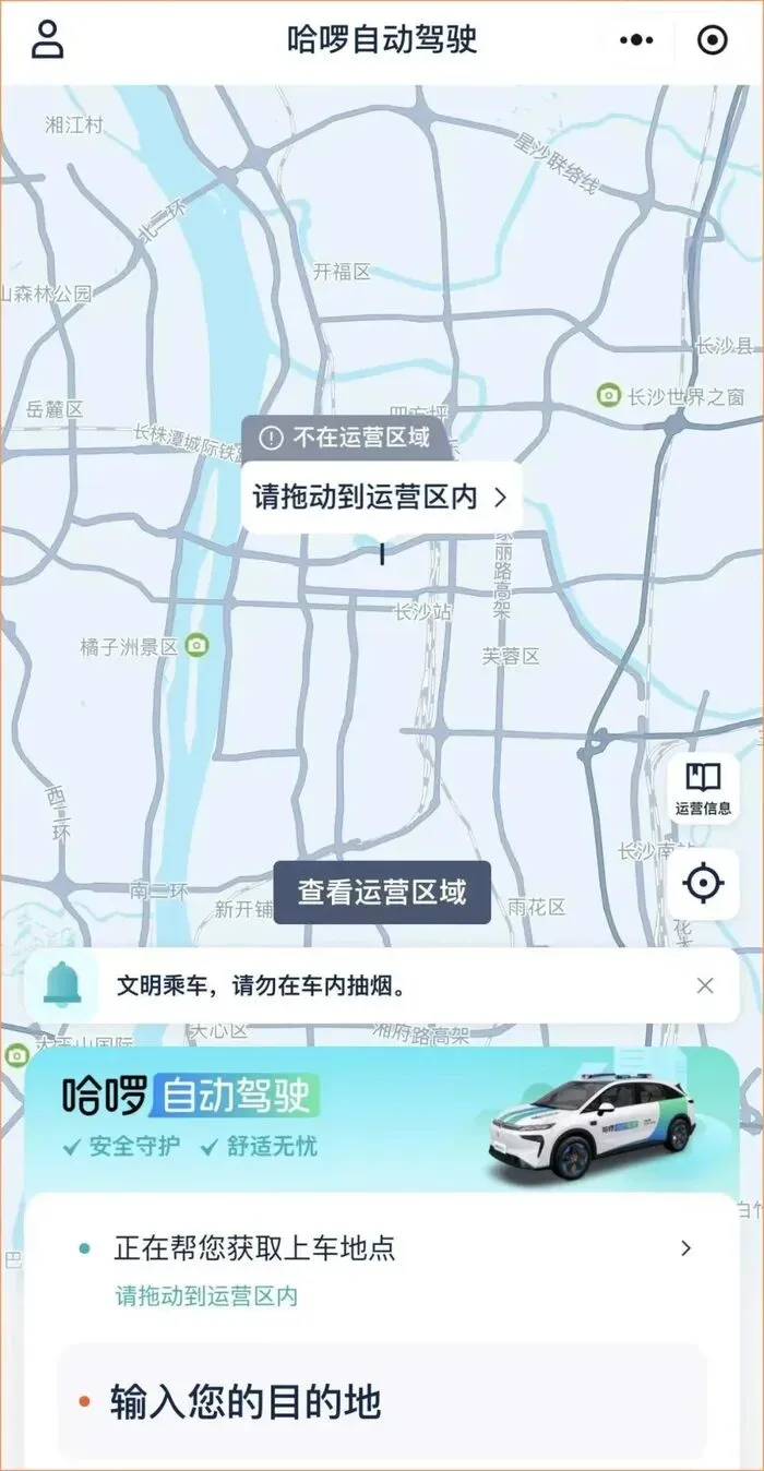 哈啰自动驾驶小程序已经上线,注册主体为广州造父智能科技有限公司。不过,目前长沙多个地区显示不在运营区域。