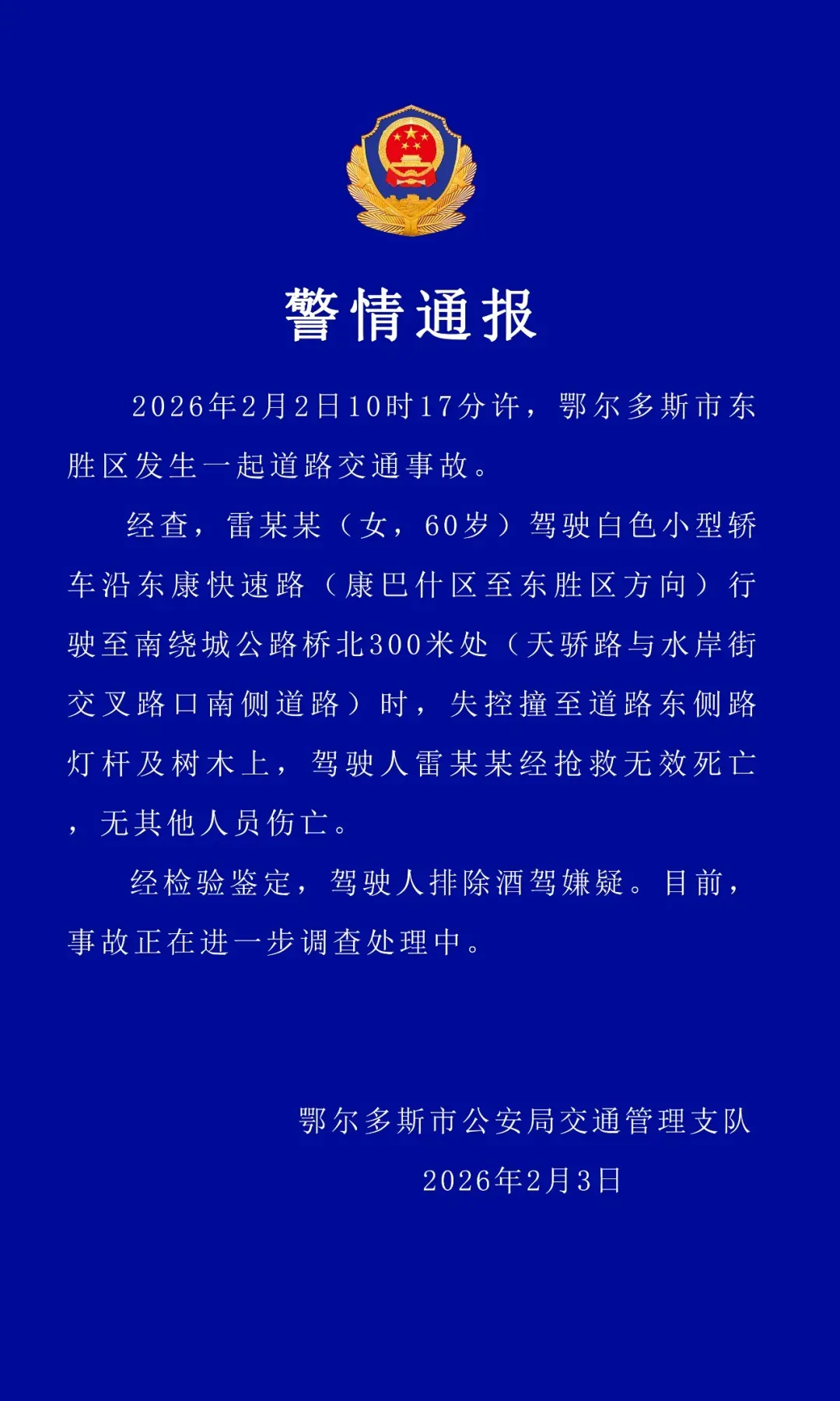 2月3日,内蒙古鄂尔多斯市公安局交通管理支队发布警情通报:2026年2月2日10时17分许,鄂尔多斯市东胜区发生一起道路交通事故。经查,雷某某(女,60岁)驾驶白色小型轿车沿东康快速路(康巴什区至东胜区方向)行驶至南绕城公路桥北300米处(天骄路与水岸街交叉路口南侧道路)时,失控撞至道路东侧路灯杆及树木上,驾驶人雷某某经抢救无效死亡,无其他人员伤亡。经检验鉴定,驾驶人排除酒驾嫌疑。目前,事故正在进一步调查处理中。此前报道: