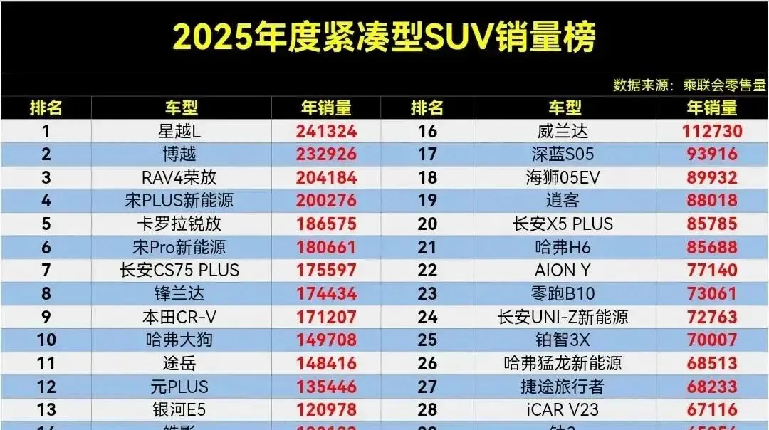 2025年紧凑型SUV销量榜一出,我直接瞳孔地震——吉利星越L卖了24.1万辆,稳坐头把交椅;哈弗H6呢?直接掉到第21名,8万多辆,比去年腰斩一半。更绝的是,比亚迪宋PLUS这老将,也栽了,退居第四。