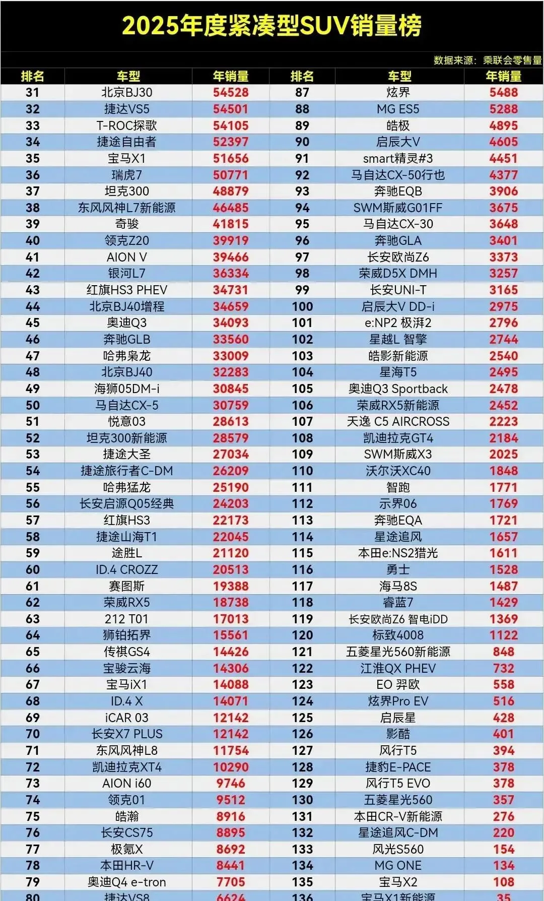 最扎心的是结尾部分。31到141名这档,北京BJ30卖5.4万,日产奇骏才4.1万,北京BJ40增程、奔驰GLB都卡在3.4万。马自达CX-5、坦克300新能源在2-3万徘徊,传祺GS4的1.4万,简直像被车市遗忘的孤儿。
