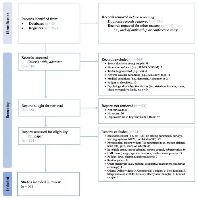 筛选标准严格:必须涉及SAE 2级或3级自动驾驶系统;仅限包含实验的实证研究;必须报告客观的驾驶测量数据;排除纯理论论文、综述、仅关注老年人或特定医疗状况人群的研究;经过层层筛选,最终纳入了51篇高质量研究进行详细分析(见图2)。