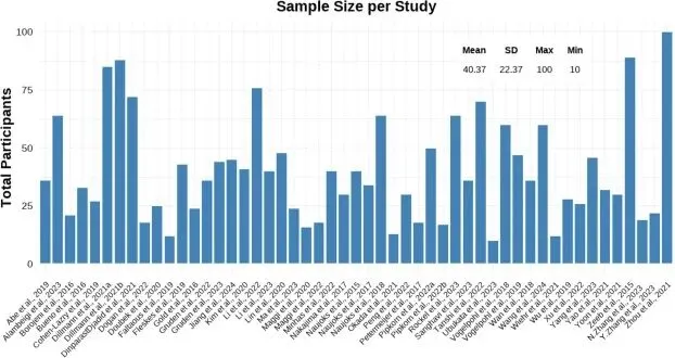 为了进行元分析,研究特别关注了样本量的大小,因为它决定了每个研究在分析中的权重。图3展示了纳入研究的样本量分布。