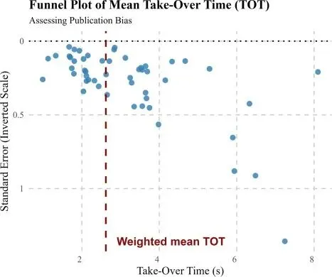 描述性统计显示,纳入研究的平均接管时间(TOT)均值为2.62秒。然而,异质性检验表明研究间存在显著差异,这说明除了随机误差外,还有其他因素导致了结果的变异,验证了进行元回归分析的必要性。漏斗图分析显示了一定的不对称性,这可能暗示存在发表偏倚,但也可能是由于反应时间数据的自然属性(即存在最小生理反应时间,且分布通常向长尾倾斜)所致(见图4)。
