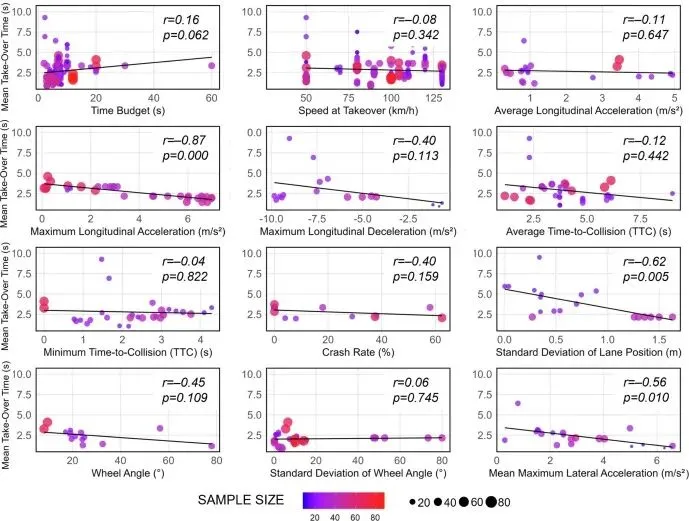 相关性分析(图6)揭示了几个关键的权衡关系:最大纵向加速度:与TOT呈强负相关。这意味着TOT越短,驾驶员的急加速行为越明显,操作越剧烈。车道位置标准差:与TOT呈显著负相关。较短的TOT伴随着更大的车道波动,表明快速接管可能牺牲了车辆控制的稳定性。平均最大横向加速度:与TOT呈负相关,同样暗示了快速接管伴随着急转弯等剧烈操作。碰撞率:虽然统计上不显著,但呈现出中度负相关趋势,即TOT越短,碰撞率似乎越高。这提示我们,过快地强迫驾驶员接管可能会增加事故风险,因为他们可能没有足够的时间全面评估环境。