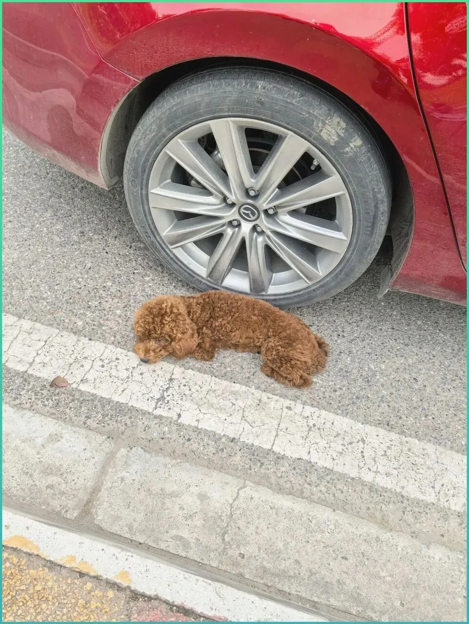 那天去办事,把车.停在.路边.划线位里。刚下车,就看见轮胎边.蜷着一团.棕色的影子.。