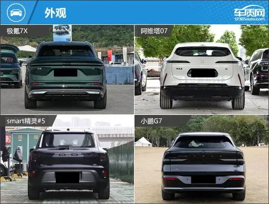 前文已提到,四款车型在定位与目标受众上略有差异,这一点在外观层面便有直观体现。极氪7X采用Hidden Energy设计理念,整体造型圆润大气,家用气质最为突出。阿维塔07延续未来美学的原创设计思路,碟翼式前脸极具辨识度,个性取向鲜明。smart精灵#5造型相对方正,是四款车中风格最为硬朗的一款。小鹏G7则以家庭科技美学为核心,通过流线型车身勾勒出温和的视觉轮廓,在时尚与简约之间取得了平衡。