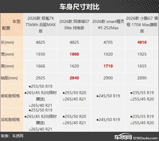 在车身尺寸方面,阿维塔07凭借车宽和轴距上的优势,可以带来更加宽敞、舒适的乘坐空间。小鹏G7和smart精灵#5同样不乏亮点,分别在车长和车高上领先,而极氪7X的车身尺寸十分均衡,并无明显短板。