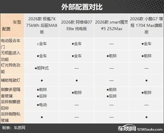 在外部配置方面,极氪7X整体配置水平较高,在便利性与私密性相关功能上覆盖较为全面。小鹏G7和阿维塔07均标配电动吸合车门,使用体验上同样不俗。而smart精灵#5在外部配置上缺失较多,但其配备了前后排侧窗多层隔音玻璃,对提升座舱静谧性起到了积极作用。