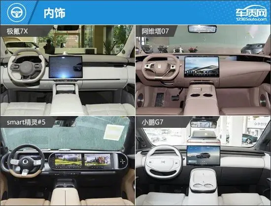 与外观一样,四款车在内饰层面同样展现出鲜明的“性格”差异。极氪7X延续偏居家的设计取向,整体造型简约温馨,同时保留了部分实体按键,兼顾质感与日常操作便利性。阿维塔07的科技氛围最为突出,35.4英寸全景远端屏将关键信息集中显示,十分直观。smart精灵#5的座舱设计带有明显的奔驰设计基因,大量圆形元素的运用令整体氛围更显活泼。小鹏G7则将极简理念贯彻到底,取消传统仪表屏幕,车辆信息主要通过AR-HUD增强现实抬头显示与中控屏进行呈现,风格取向十分明确。