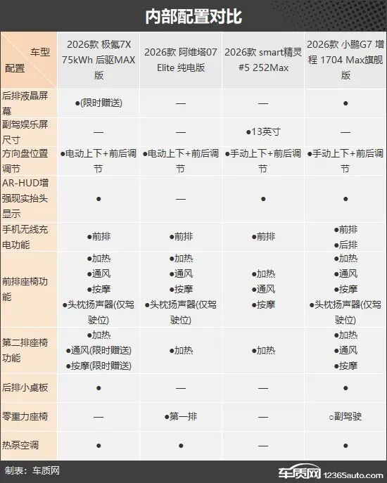 在内部配置方面,四款车整体表现均较为出色。其中,极氪7X在官方限时购车权益的加持下,配置水平已与小鹏G7基本持平,功能覆盖全面。阿维塔07和smart精灵#5在配置丰富度上略逊一筹,但前者标配第一排零重力座椅,后者则独享13英寸副驾娱乐屏,针对性体验各有侧重。