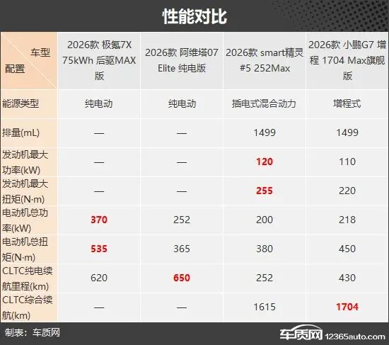 性能方面,四款车能源类型有所不同,极氪7X与阿维塔07采用纯电动形式,smart精灵#5为插电式混合动力车型,而小鹏G7则为增程式。其中,smart精灵#5的发动机参数占据优势,而极氪7X的电动机性能更为强悍。在续航能力上,小鹏G7将增程的优势发挥到了极致,CLTC综合续航表现最佳。