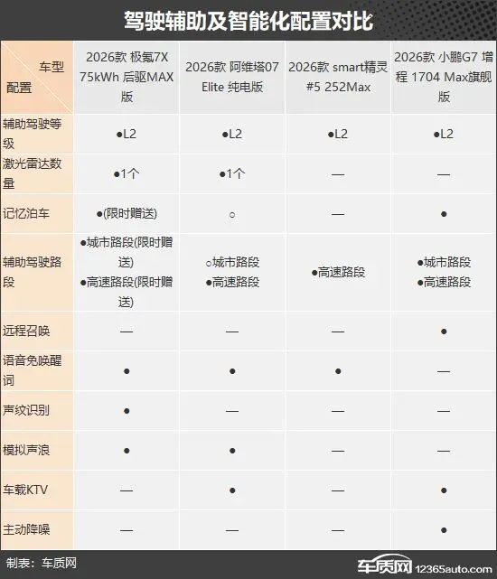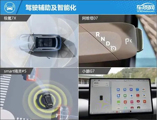 辅助驾驶方面,四款车均具备L2级辅助驾驶能力,其中极氪7X和阿维塔07均搭载了1个激光雷达,硬件水平具有优势。但从实际可实现的功能来看,小鹏G7反而表现最为全面,整体使用体验更佳。