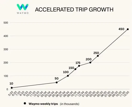 Waymo无人出租车每周出行量(单位:千次)的增长趋势图(图片来源:Waymo)