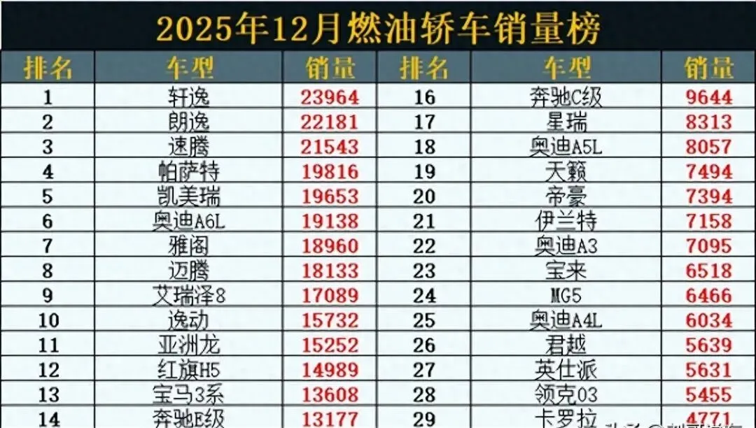 乘联会最新公布的2025年12月燃油轿车销量数据显示,即便在新能源车持续抢占市场的当下,燃油轿车依旧展现出强劲的市场韧性,上演了一场销量"大胜"。数据显示,12月共有15款燃油轿车月销量突破1万辆,其中合资品牌依旧占据绝对主导地位,直接包揽了榜单前8名,而国产车在燃油轿车领域的进步也相当明显,已有3款车型成功跻身"万辆俱乐部",星瑞、帝豪等热门国产车型也稳稳留在榜单前20名。不过曾经的"家轿之王"卡罗拉表现却让人意外,不仅月销量不足5000辆,排名更是险些跌出前30名。