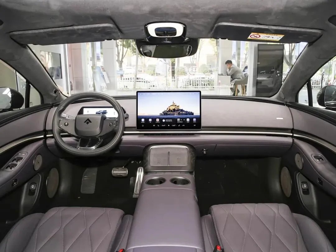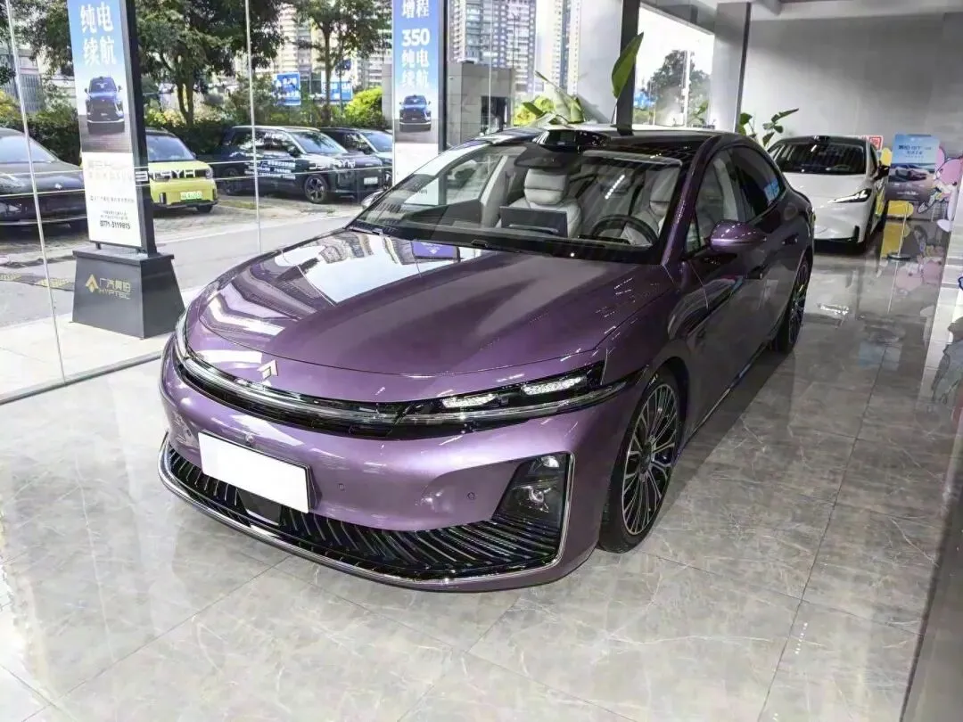 再来看车身侧面部分,车身尺寸为5130mm×1966mm×1500mm,轴距达3020mm,1.31倍的黄金宽高比赋予其宽体低趴的轿跑风格。溜背式设计搭配隐藏式门把手,风阻系数降低明显,C柱导流鳍片进一步提升了行驶稳定性。20英寸“大饼”轮毂提供行政商务与运动两种风格选择,无框车门则增添了高级感。车身配色包括水晶紫、极地白等6款,满足个性化需求。