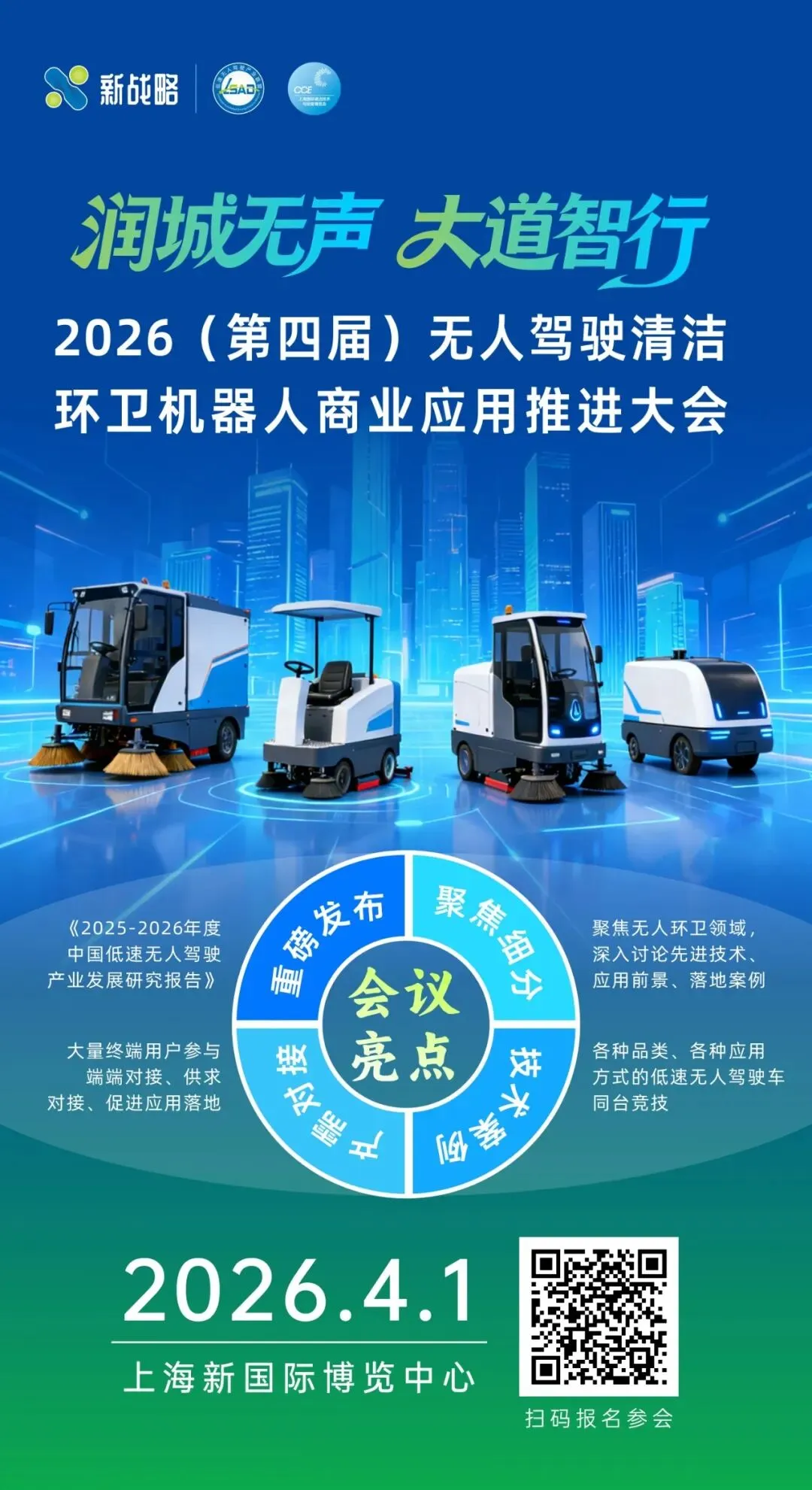 2026年4月1日,低速无人驾驶产业联盟将在上海新国际博览中心举办2026(第四届)无人驾驶清洁环卫机器人商业应用推进大会,会上将发布《2025-2026年度中国低速无人驾驶产业发展研究报告》,敬请期待!