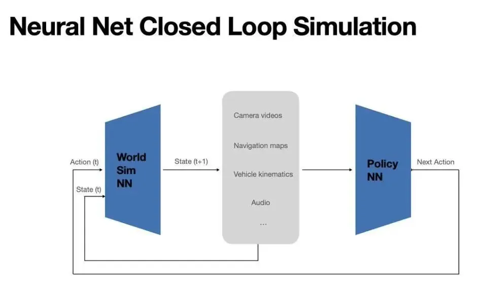 特斯拉并未使用“世界模型”的概念,而是采用了“世界模拟器”的说法(特斯拉自动驾驶副总裁Ashok Elluswamy在去年的ICCV上首次提及),该模拟器基于特斯拉自建的海量数据集进行训练,根据当前状态与下一步动作生成未来状态。从而与车端的端到端基础模型闭环,做真实效果的评估。