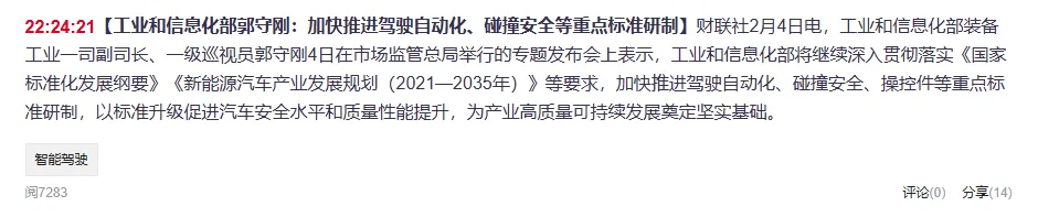 2月4日,工信部装备工业一司副司长郭守刚在专题发布会上明确表态,将加快推进驾驶自动化、碰撞安全、操控件等重点标准研制,依托标准升级推动汽车安全水平与质量性能提升,为产业高质量发展筑牢根基。