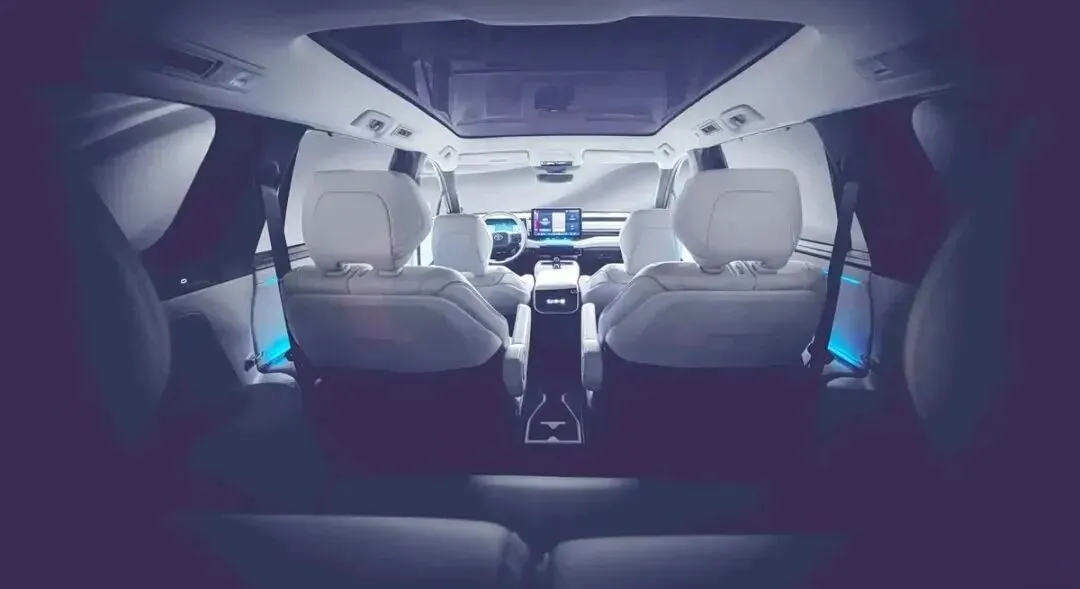 座椅采用双色拼接设计,中央扶手区域设有触控屏,过道区域则精心布置了杯架等便利设施。车辆还配备了大尺寸天幕和氛围灯,提升了驾乘体验。