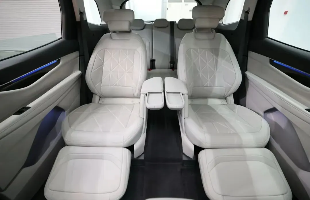 在2+2+3布局下,第二排为独立座椅,提供三种一键座椅模式。其中“一键舒躺模式”可将座椅调节至近乎零重力状态。第二排座椅中央留出了约200mm宽的过道,比不少MPV车型的过道还要宽。