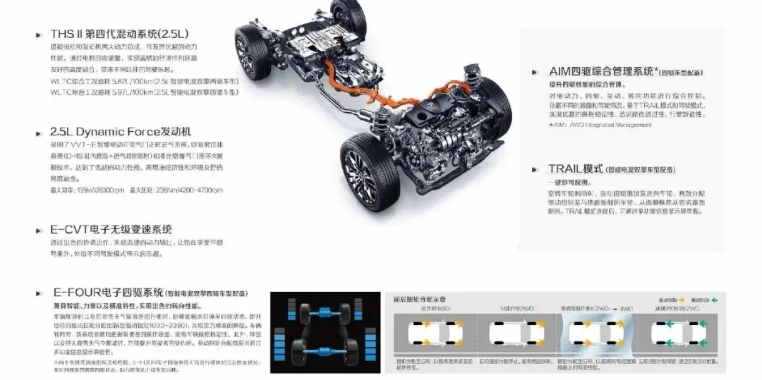 汉兰达双擎搭载丰田THS II混动系统,采用2.5L自然吸气发动机配合双电机。虽然广汽丰田没有强调其综合马力,但其实发动机部分有189Ps,双电机有237Ps。