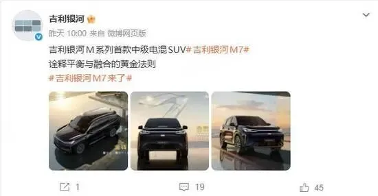 吉利银河发布了旗下M系列首款中级电混SUV——吉利银河M7的官图及相关信息。新车定位为5座中型SUV,搭载了1.5L插电混动系统,纯电续航最高可达225km,综合续航里程更是达到了1730km。根据官方规划,新车预计将在今年上半年正式上市。