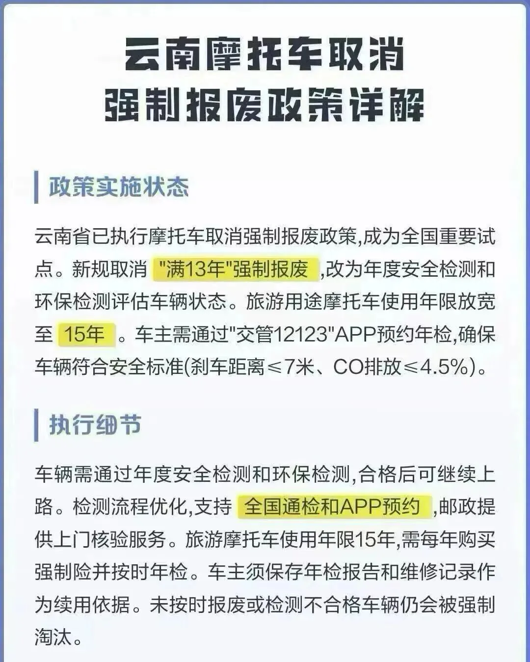 ⭕2、【云南试点取消摩托车13年强制报废?】据网络消息,云南省开始执行摩托车取消强制报废政策,采用延长检测的方式,将旅游用途摩托车使用年限放宽至15年,民用摩托车(含大排量及进口)只要检测合格可永久使用。目前该消息尚未得到官方确认。