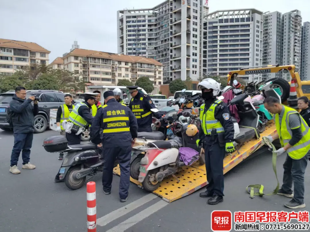 ⭕7、【南宁严查电动自行车乱停放】近日,南宁市交通部门开展交通秩序专项整治,对占用机动车道、非机动车道、人行通道等电动车违停行为进行查处,对驾驶人不在场的车辆实施拖移。