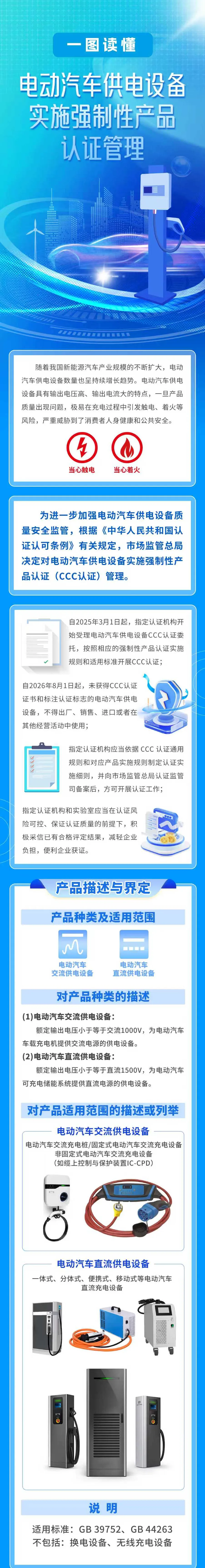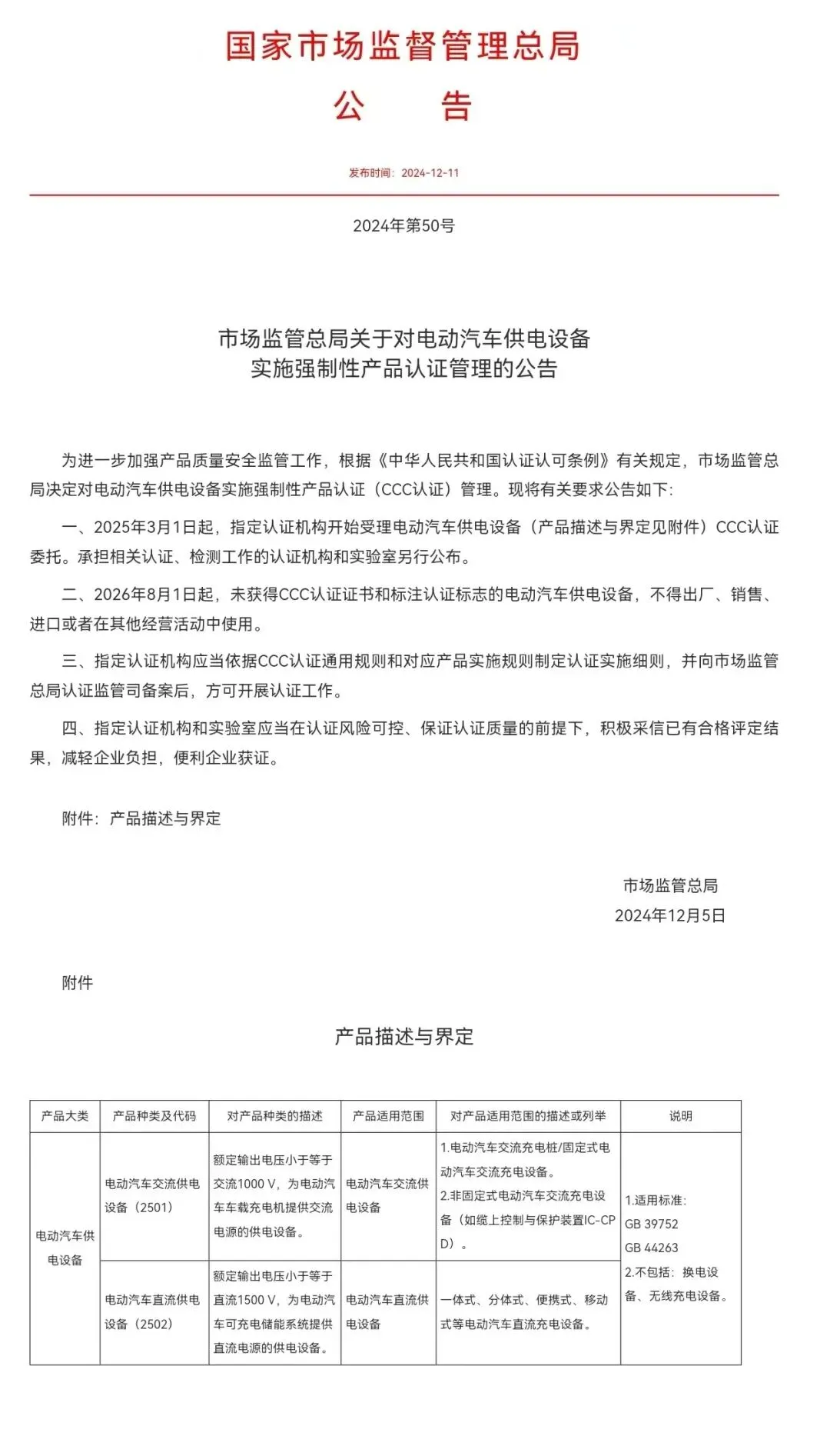 按照国家市场监督管理总局2024年第50号公告,自2025年3月1日起,相关认证机构开始受理电动汽车供电设备(包括但不限于电动汽车交流充电桩/固定式电动汽车交流充电设备,非固定式电动汽车交流充电设备,一体式、分体式、便携式、移动式等电动汽车直流充电设备等)CCC认证委托。根据公告内容,自2026年8月1日起,未获得CCC认证证书和标注认证标志的电动汽车供电设备,不得出厂、销售、进口或者在其他经营活动中使用。