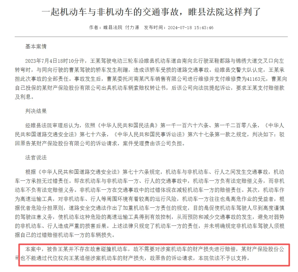 总结下来:河南多地法院的观点高度一致——非机动车全责,不用赔机动车车损。