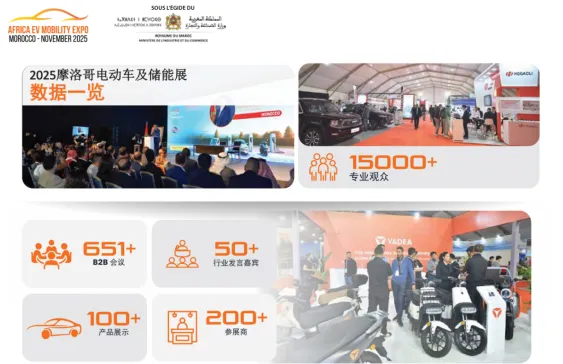 2025年11月19-22日,首届 AFRICA EV MOBILITY EXPO(EVS Morocco 2025)在摩洛哥卡萨布兰卡安法公园(Anfa Park)成功举办 。在超过 15000 平方米的展出面积中,吸引了 120 多家参展企业集中亮相,全面覆盖新能源汽车、储能技术及充换电基础设施等核心领域 。本届展会由摩洛哥工业与贸易部特别支持,汇聚了中信戴卡、贝特瑞、雅迪(YADEA)、天赐材料(TINCI)、台铃等行业领先品牌,充分展现了摩洛哥电动出行产业“国际化、专业化、全产业链”的蓬勃态势 。