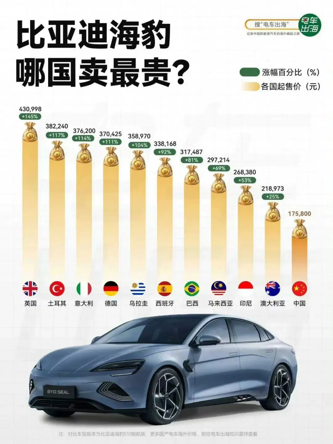 以比亚迪海豹为例,国内17万起,澳洲起售价最便宜,只比国内贵了4万元…