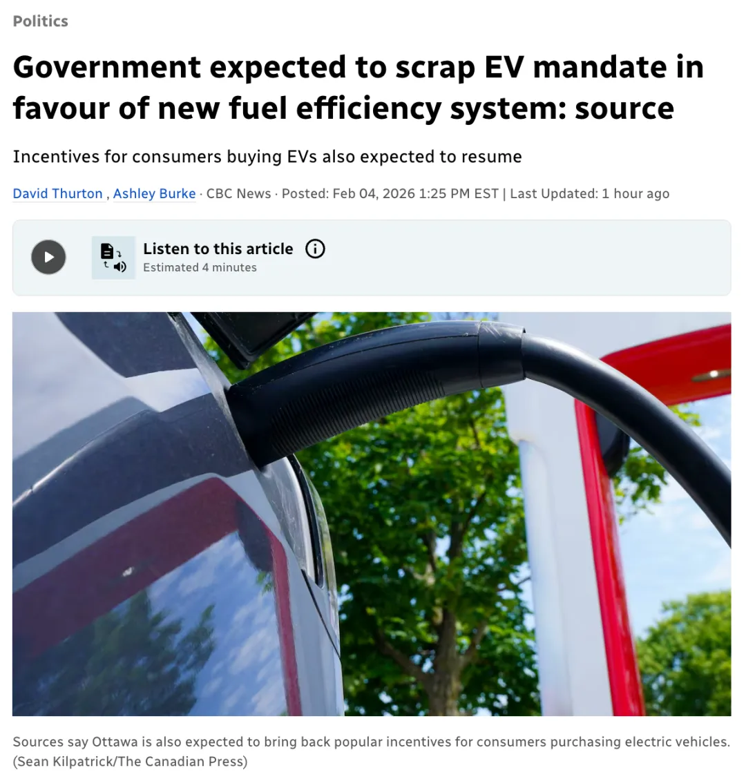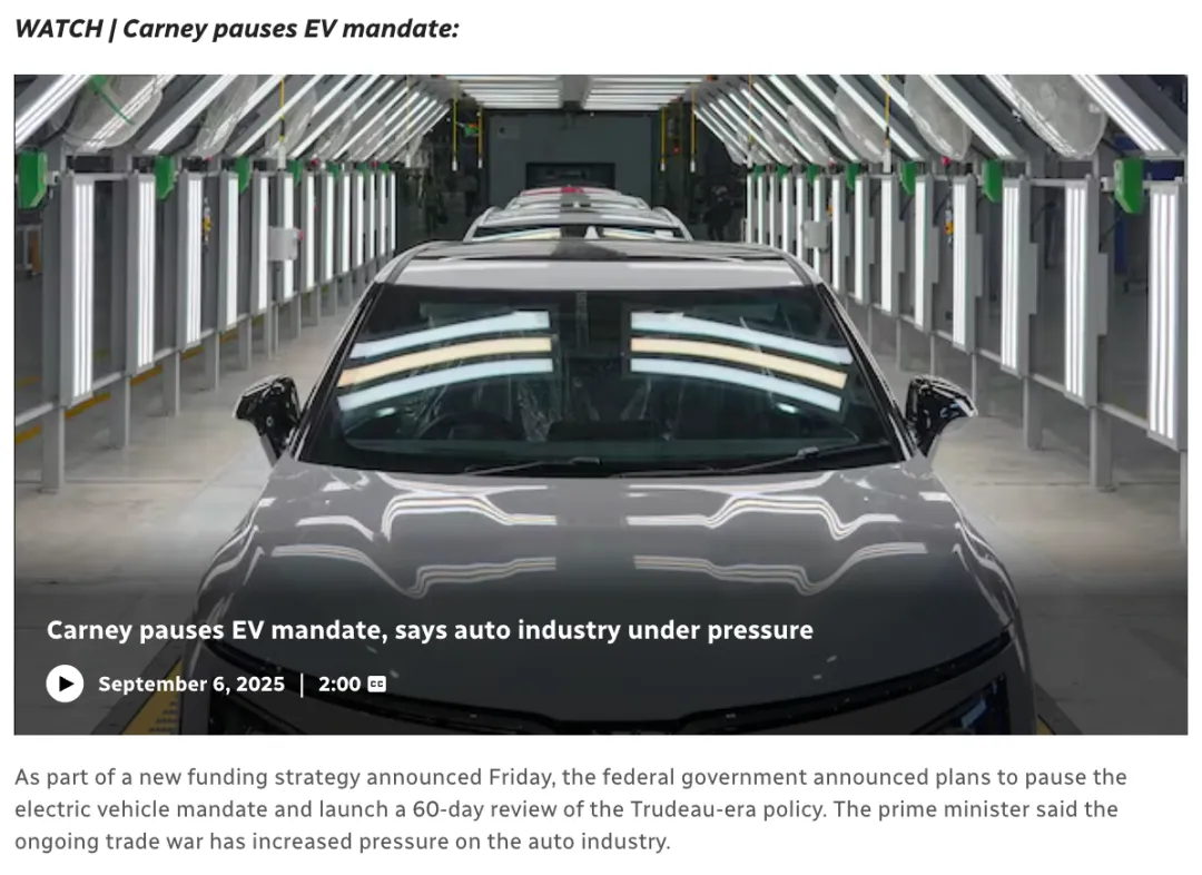 9月,卡尼暂停了2026年的目标,并宣布对电动汽车强制令进行60天的审查,理由是加拿大汽车行业已经“忙得不可开交”,要应对美国总统唐纳德·特朗普的关税政策。