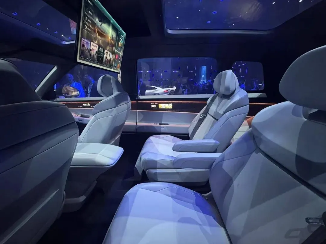 内饰我.必须多说.两句.啊。坐进来.第一.感觉是——终于不是.那种“毛坯房”内饰.了,这种悬浮.双联.屏加上.吸顶.屏的.设计,让人觉.得这车.跟理.想、问界那.种主流.智能车接.上了轨。然后.我稍.微往.前伸手.敲了.敲中.控,咚咚.两下,完全.是软包,拼接整.齐,没什么.毛边。我身高.一米.八,坐在.中排.那两.个独立座.上,腿部.空间是真.的特别.特别充裕,翘个.二郎腿.都没问题。后排.第三排.向后调.一点.还能.坐成年人,但坐姿.就高.了点。不过六.座布局.好处明.显,每个位.置都能自.由出.入,不像.七座那.种中间.被“卡住”的。