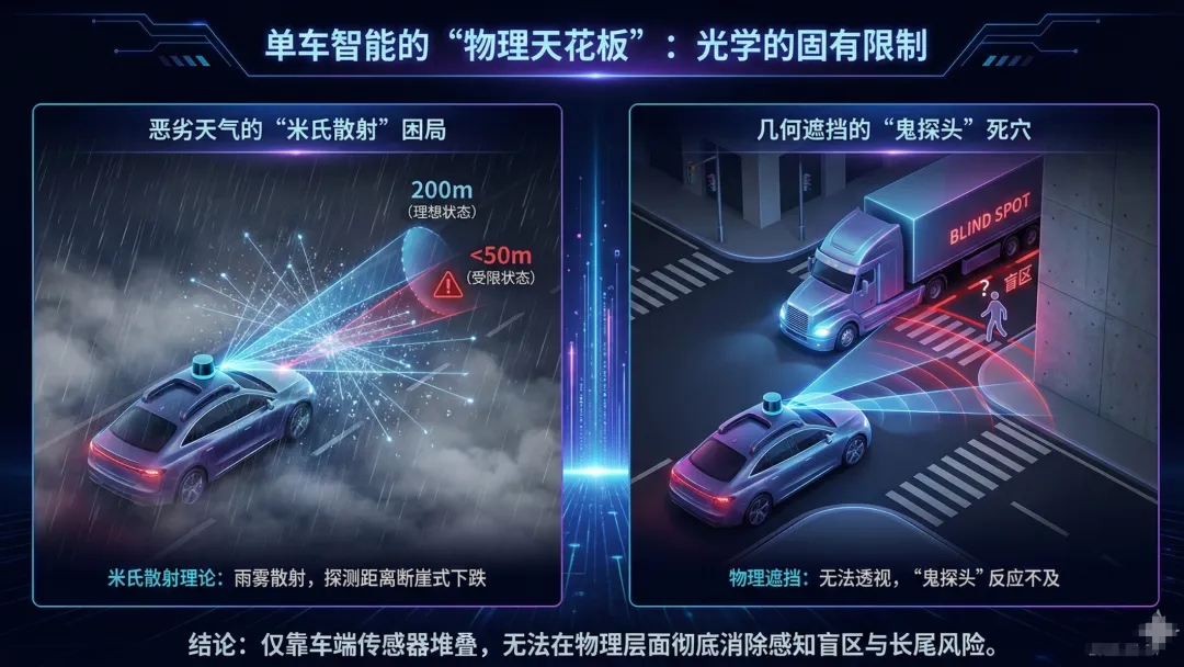 比天气更可怕的是物理遮挡。在城市道路的十字路口,大型车辆遮挡视线、行人从盲区突然冲出(鬼探头),是单车智能无法逾越的“几何死角”。无论车端的算法多先进,它都无法透视混凝土墙壁或前方的大货车。依靠单车传感器,只有当行人真正出现在视野中时才能做出反应,而这往往意味着——来不及了。