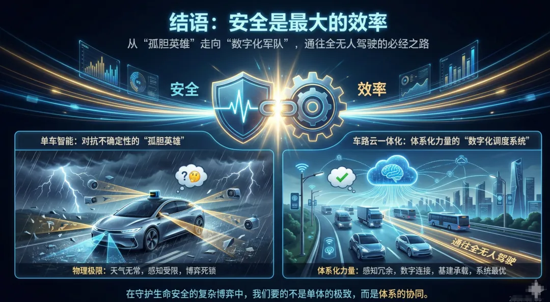 作为交通安全方面的从业者,另外也跟很多同行交流过类似的问题,我个人认识:车路云一体化,不是效率的倍增器,而是自动驾驶跨越安全鸿沟的必要条件,是守住生命底线的系统安全底座。