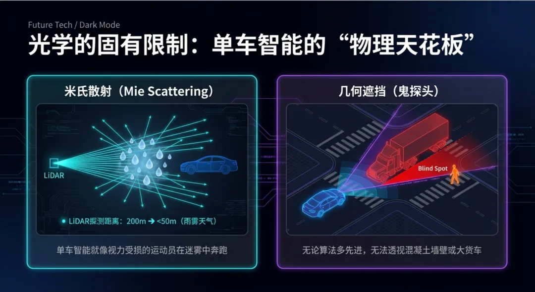 单车智能的核心逻辑是“求诸己”,即通过不断堆叠激光雷达、毫米波雷达和摄像头,试图让车拥有超越人类的感知能力。但遗憾的是,物理定律是公平的,也是残酷的。