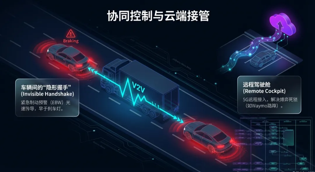当车辆遭遇单车智能无法处理的困境(如传感器故障或复杂博弈死锁)时,云端不再是旁观者,而是远程驾驶舱(Remote Cockpit)。通过5G低时延网络,云端可以迅速介入,由远程安全员接管或引导车辆至安全区域,避免车辆像Waymo一样由于逻辑死锁而成为路障引发二次事故,这个场景称之为远程控制驾驶,主要解决脱困问题,避免次生事故。