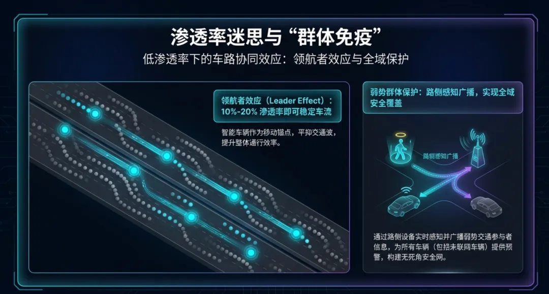 领航者效应(Leader Effect),我们做交通安全的仿真都知道,当联网车辆渗透率达到10%-20%时,交通流的安全性就会出现拐点。联网车辆像巨石一样平抑后方车流的波动,减少急刹车频率,从而降低连环追尾风险。这个就是同济大学马教授提到的“以粒控流”。