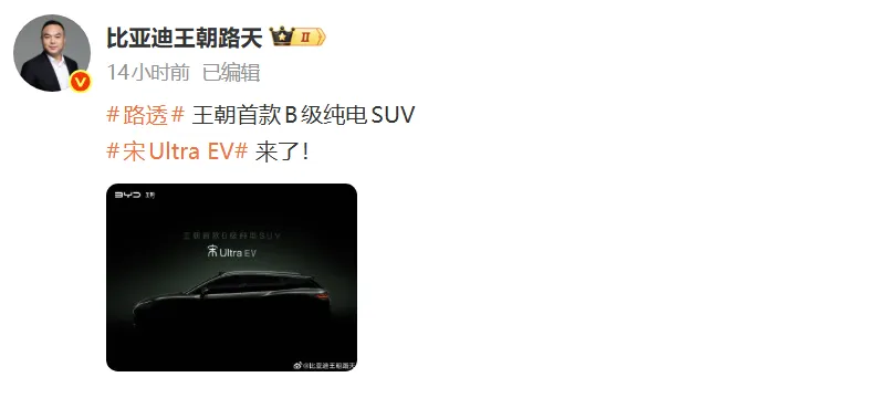 2026年2月4日,比亚迪王朝网销售事业部总经理路天在社交平台正式官宣:王朝网旗下首款B级纯电SUV——宋Ultra EV即将登场。这一消息迅速引发行业与消费者的广泛关注。作为比亚迪王朝系列向高端纯电市场迈出的关键一步,宋Ultra EV不仅填补了品牌在20万至25万元价格区间中型纯电SUV的空白,更以“Ultra”之名彰显其旗舰定位与技术野心。