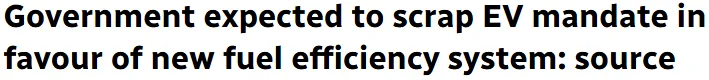 这一变化类似于欧盟去年的做法,当时欧盟提出了一项提案,取消销售目标,转而提高燃油效率。目前尚不清楚政府何时实施新系统,也不清楚新系统是否能达到与销售强制令相同的减排效果。