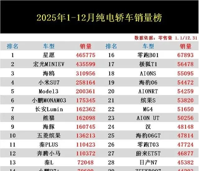 要说这榜里头,数字可真不含糊。吉利星愿一年卖出去46万多台,光听这数就觉得势头猛,宏光MINIEV也不弱,43万多台紧咬不放。海鸥和小米SU7、Model3算是第一梯队的常客,交付量都够瞧的。再往后看,长安Lumin、海豚、秦PLUS还有奔腾小马,也齐齐跨过11万的门槛,说明它们虽然没站最前头,但脚跟扎得牢,买家认可度高。零跑B01、AION S、缤果S这几个成绩也漂亮,销量都破了5万,能在这么卷的环境里稳住阵脚,没两把刷子还真不行。