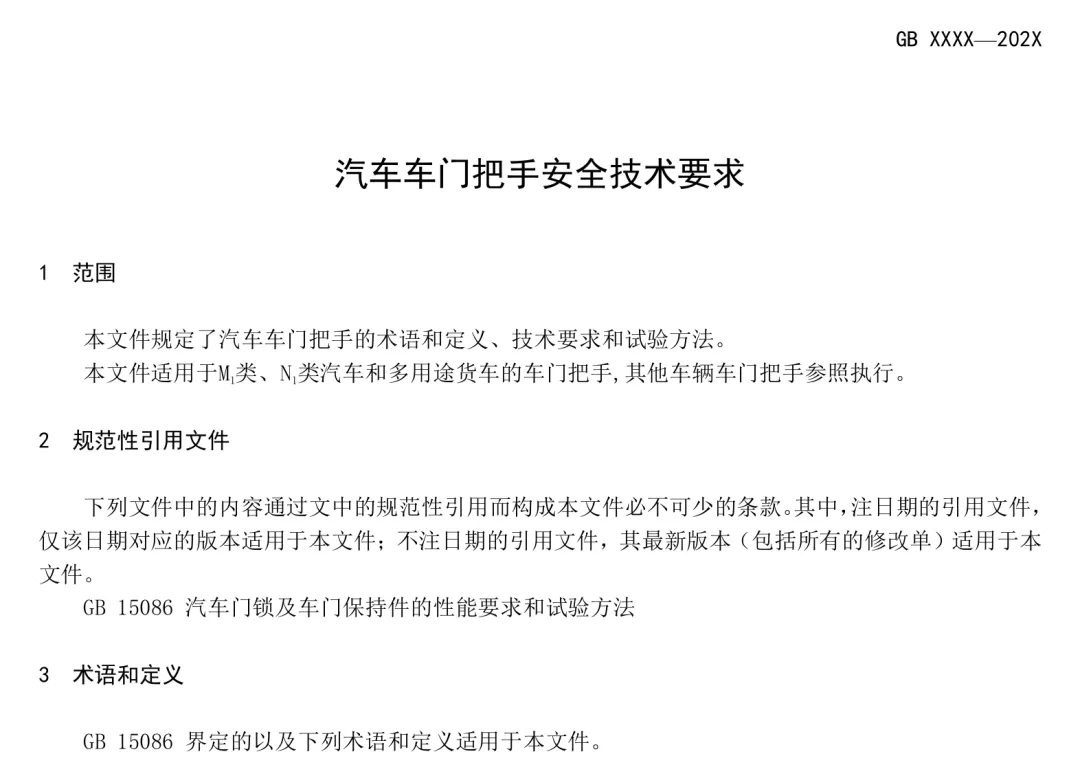 GB 48001-2026由国家市场监督管理总局、国家标准化管理委员会批准发布,该标准的出台,核心定位是“安全兜底、规范设计”,标志着中国汽车设计理念从“科技炫技”向“安全为本”的理性回归。该标准明确适用于M1类(普通乘用车)、N1类(轻型货车)汽车和多用途货车,其他类型车辆参照执行,覆盖了市场上绝大多数配备隐藏式车门把手的车型,无论是新能源汽车还是传统燃油车,只要采用隐藏式设计,均需符合该标准要求。