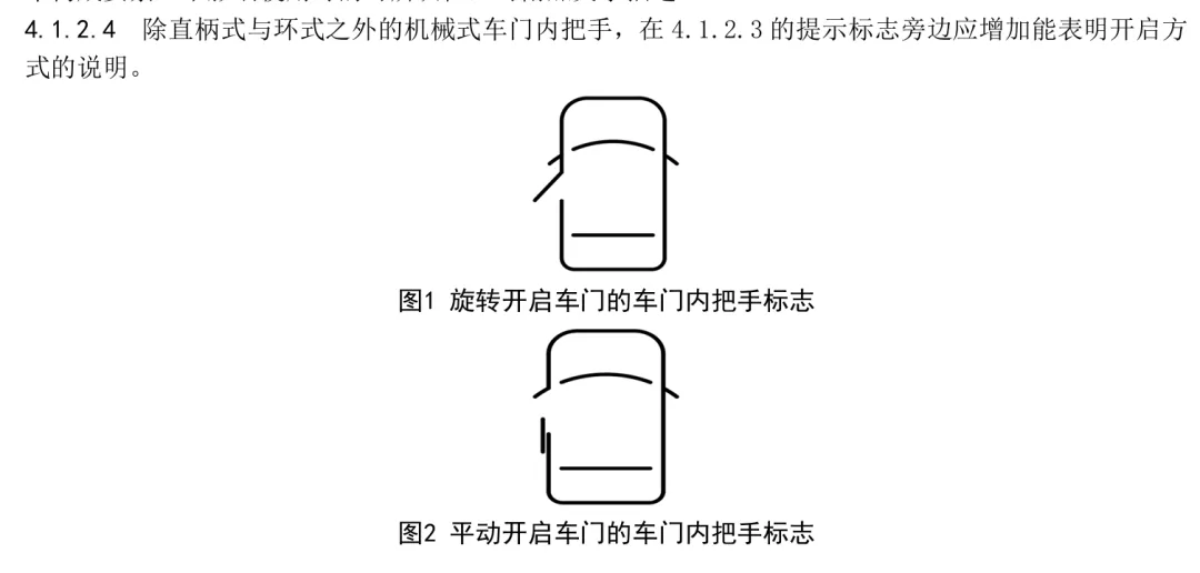 其四,内把手与标识要求,降低逃生难度。作为车内乘员的“自救开关”,内把手的要求更为严格:每个车门至少配备一个独立操作的机械内把手,无遮挡、直观可见,距离车门边缘不超过300mm,安装位置符合人体工程学,确保乘员在各种坐姿下均可轻松触及;同时,内把手(尤其是隐藏式和应急式)必须配备永久性标志,标识尺寸不小于10mm×7mm,文字说明高度不低于6mm,确保在夜间或光线昏暗环境下也能被迅速识别和正确操作。