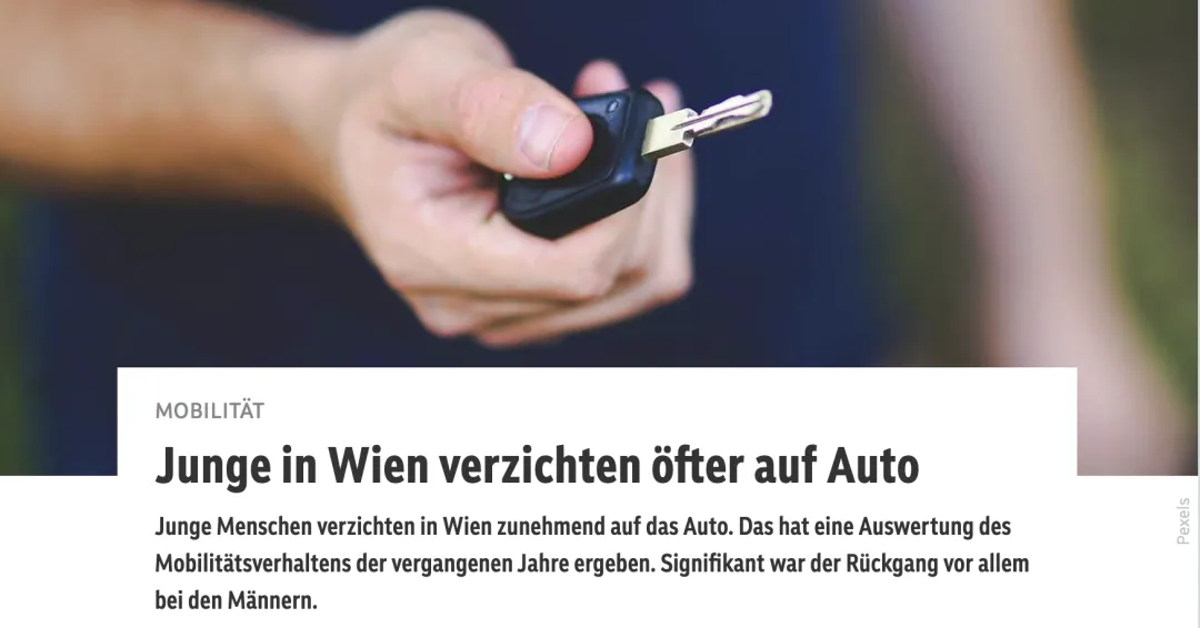 研究还指出,年轻人汽车使用比例的显著下降,也体现在越来越多人放弃拥有私家车上:在2010年至2014年间,维也纳21至30岁人群中有46%没有自己的汽车;而如今,这一比例已上升至60%。这并不意味着这些人完全不使用汽车,而是更多依赖于共享汽车(Carsharing)等服务。