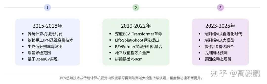 然而,BEV感知技术的发展并非一蹴而就。从2015年的手工IPM透视变换到2025年的端到端VLA模型,BEV感知经历了从”几何变换”到”端到端学习”的完整演进过程。在这一过程中,传感器标定和时间同步作为底层工程基础,始终是BEV感知技术发展的关键瓶颈和突破点。