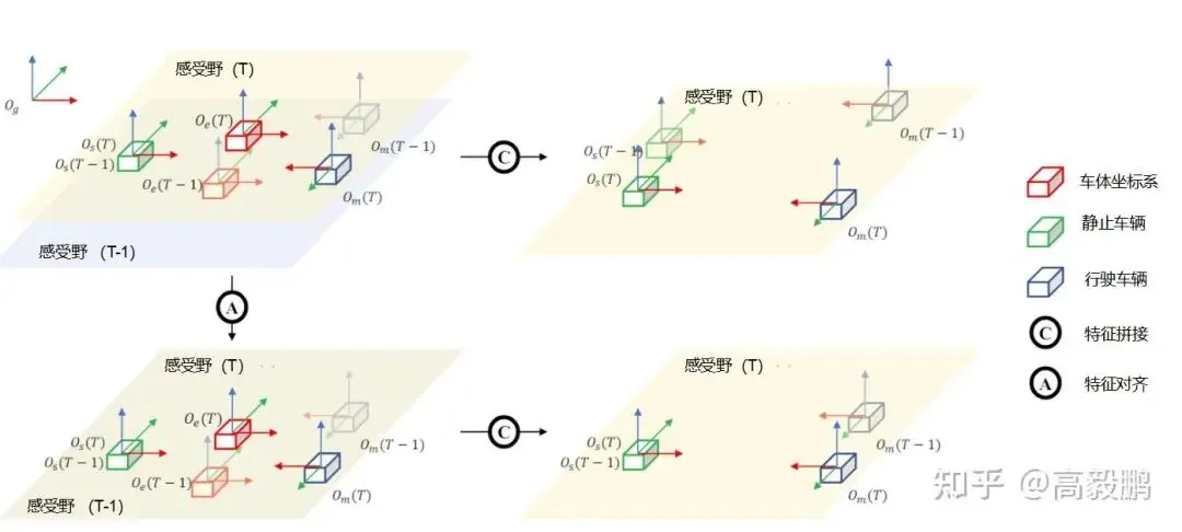 时空对齐模块基于车辆自运动参数,将前一帧BEV特征在世界坐标系中进行刚性变换,解决时空对齐误差问题。