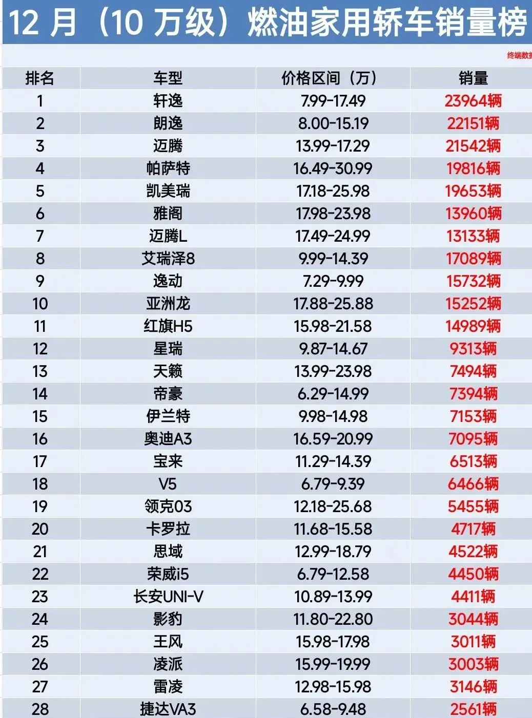 12月10万级燃油家用轿车销量榜新鲜出炉,虽然燃油车市场整体遇冷,但仍有不少车型表现亮眼。其中朗逸以高销量稳居第2名,迈腾卖出21542辆排在第3,雅阁、逸动等车型也势头不错,销量在15732辆到22151辆之间,成功进入前9名。反观部分车型则销量下滑明显,宝来、君威销量不足1167辆,跌至32名之外,燃油车市场的两极分化越来越明显。
