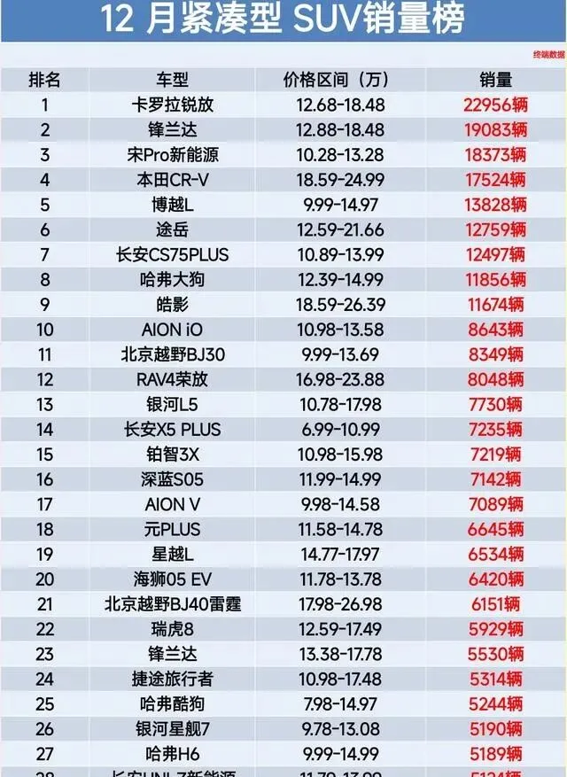 最近闲着没事翻了翻12月的紧凑型SUV销量榜,发现挺有意思的,这阵子大家选车好像都挺实在,盯着销量靠前的车型琢磨,毕竟跟着大伙儿选,踩坑的概率能小点。这回榜单里不少熟脸,有的稳坐前排,有的悄悄往上挪,还有几款让人觉得“哎,这车卖得可以啊”,咱就挑几个有意思的唠唠。